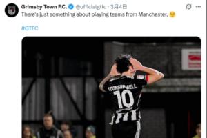 比赛结束后,格林斯比官方晒出比分图,并且配文:“和来自曼彻斯特的球队踢比赛真的有点说法的。😏”