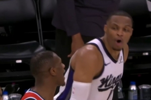 比赛最后时刻,威少与快船后卫克里斯·邓恩爆发口角,威少怒喷道:“你TM就是个无名小卒、无名小卒。你是谁?来试试?你根本不敢。滚回去吧(此时邓恩被换下),你TM在说什么?”