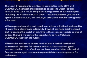 24直播03月16日讯 2026年卡塔尔足球节因领空关闭和旅行限制,经与欧足联、南美足联协商后宣布取消。原定在多哈举办的阿根廷对西班牙欧美杯等赛事将易地举行。组委会表示欢迎未来主办其他赛事,并承诺为购票球迷30天内自动全额退款。