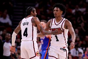 本赛季至今,阿门三分命中率22.3%,杰伦·格林则是30.9%。